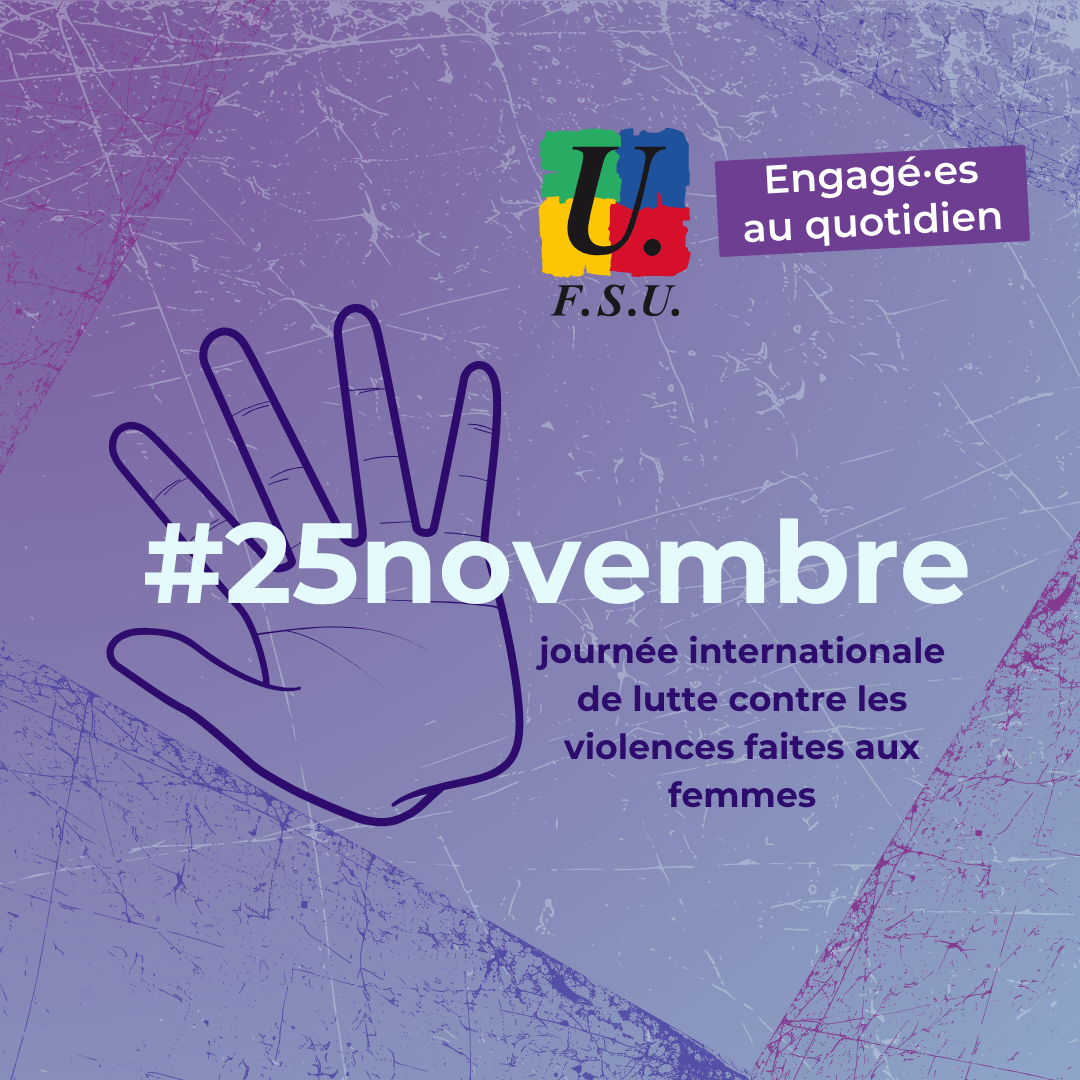 Depuis toujours, la FSU est impliquée dans la lutte contre les violences sexistes et sexuelles. Pour la journée internationale, plusieurs rassemblements et manifestations sont prévues dans le Morbihan : Samedi 22 novembre : village revendicatif à LORIENT, de 14 h à 18 h Place Glotin Mardi 25 novembre : à 18 h 30 manifestation à VANNES, Esplanade du Port, à 18 h 30 aussi, manifestation à LORIENT, Place de [...]